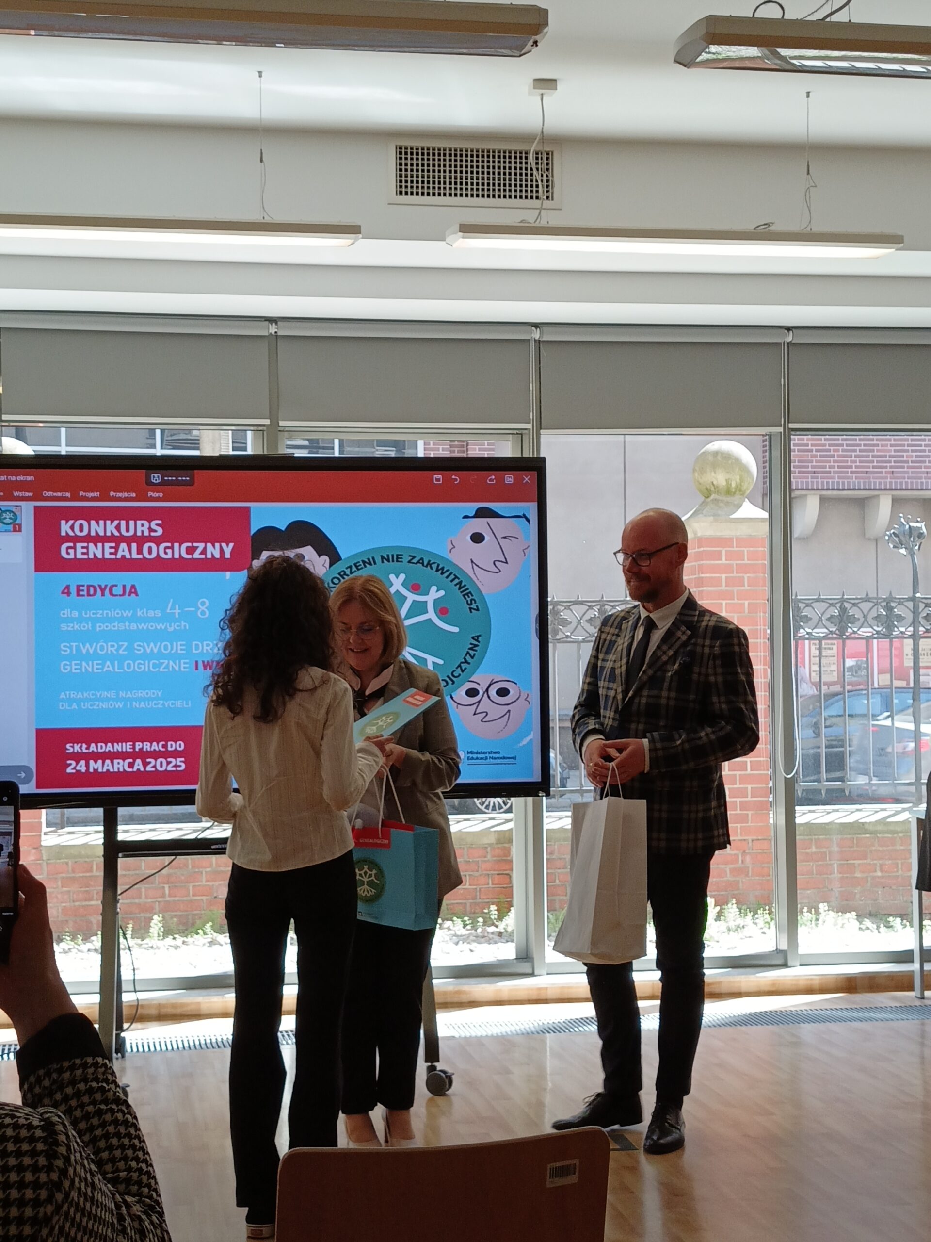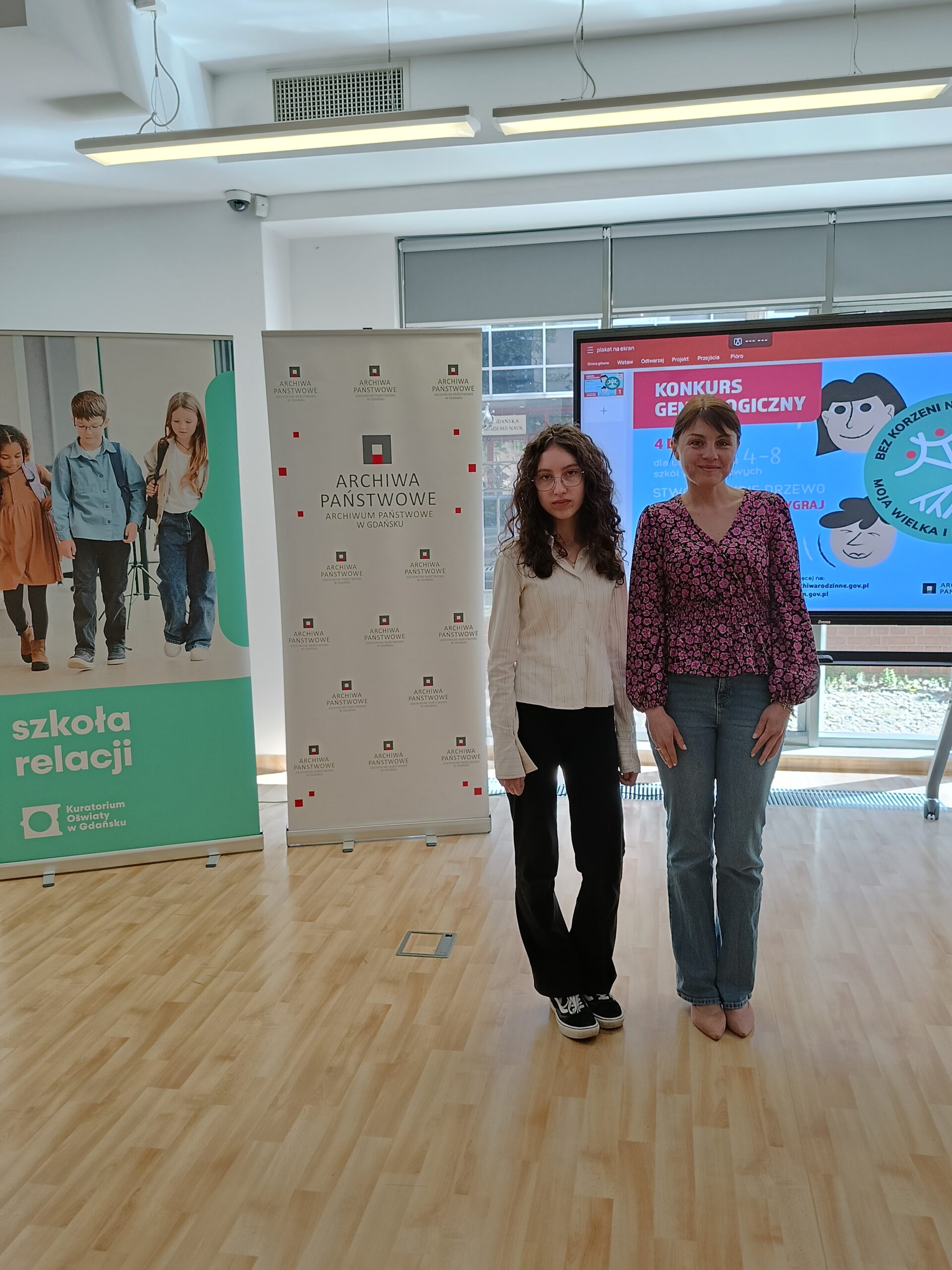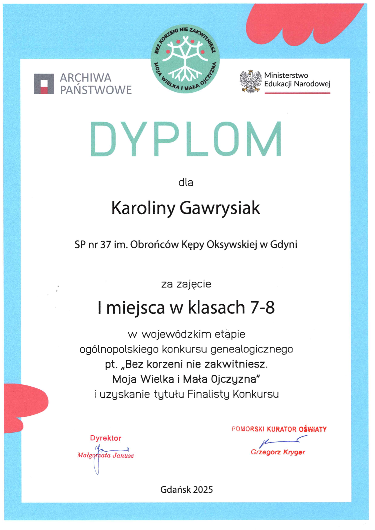 7 maja, w środę, uczennica klasy 8c, Karolina Gawrysiak, z rąk Pomorskiego Kuratora Oświaty, Pana Grzegorza Krygera, odebrała nagrodę za zajęcie I miejsca w kategorii klas 7-8, w wojewódzkim etapie ogólnopolskiego konkursu genealogicznego „Bez korzeni nie zakwitniesz. Moja Wielka i Mała Ojczyzna” organizowaniego przez Archiwa Państwowe i Ministerstwo Edukacji Narodowej. Gala wręczenia nagród odbyła się w siedzibie Archiwów Państwowych w Gdańsku.